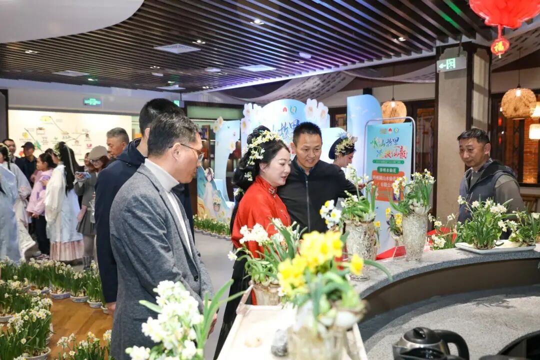 本次活动以“地理标志+非遗”为核心打造五大特色体验环节:“水仙风姿”展区集中呈现精品雕刻作品与限定盆栽,尽显产业匠心;“国风雅韵”走秀将古典服饰与水仙美学相融,成为热门打卡点;专家讲堂解读水仙栽培史与地理标志内涵,深化公众认知;非遗体验区大师亲授雕刻、棉花画技艺,数十件参与者作品成为活动纪念;“凌波投壶”、地理标志盲盒抽奖等互动环节,让跨年夜氛围热烈。